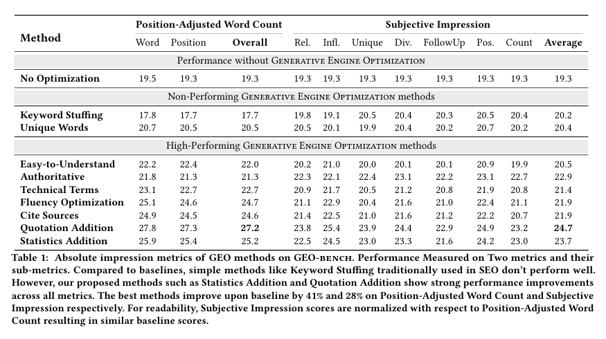 - 1. 内容质量与可信度是关键:诸如“添加引语”、“增加统计数据”和“引用来源”等增强信息可信度和实质性的方法效果最为显著,能使内容可见性提升高达30%-40%。
